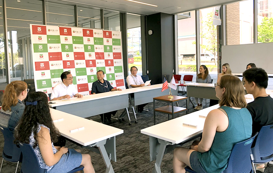 「語学・文化研修プログラム」で静岡草薙キャンパスを訪れているクレイトン大学(ネブラスカ州オマハ市)の学生が、6月25日(火曜日)に江藤学長を表敬訪問しました。9名の学生がそれぞれ日本語で自己紹介をしたのち、本学で1週間を過ごした感想を語りました。江藤学長は1988年から続く本学とクレイトン大学との長い交流の歴史について触れながら英語で歓迎の言葉を述べました。