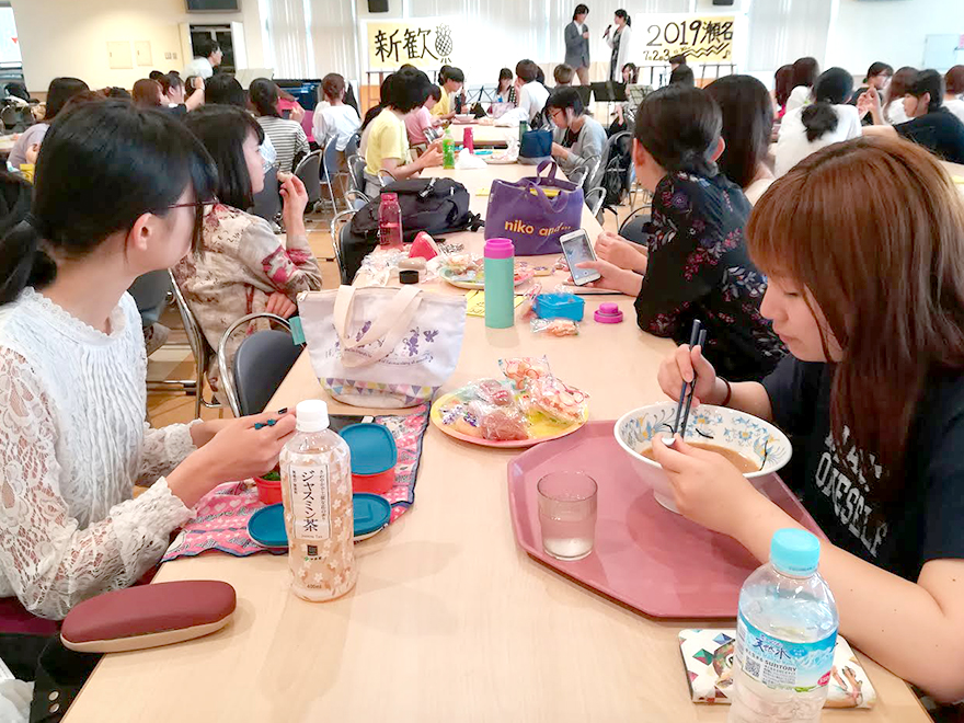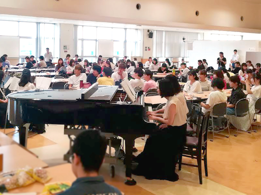 造形学部・短期大学部音楽科 合同の新入生歓迎会が、7月2日(火曜日)・7月3日(水曜日)に静岡瀬名キャンパスの学生ホールにて開催されました。初日は造形学部生のパフォーマンスやサークル紹介、2日目は音楽科学生9名による演奏が行われ、2日間で約300名の学生が参加し、昼休みの時間を共有し交流を楽しみました。 静岡草薙キャンパスからも学生が参加し、大変賑やかな会となりました。