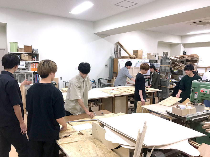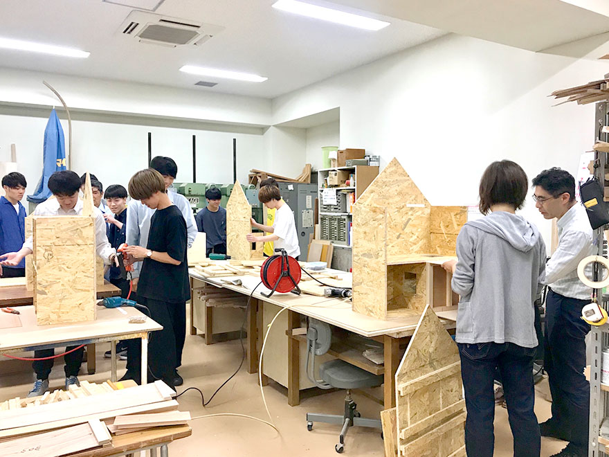 静岡県消防学校は、消防職員や消防団員に対する、知識・技術の習得のための教育・訓練施設です。このドールハウスは、木製の簡易なものですが、建物火災における火や煙の動きと、開口部の開閉によるその変化を知るための燃焼実験で使われます。この製作では、造形学部の木工施設を用いることで、部材を隙間なく接合することが求められました。