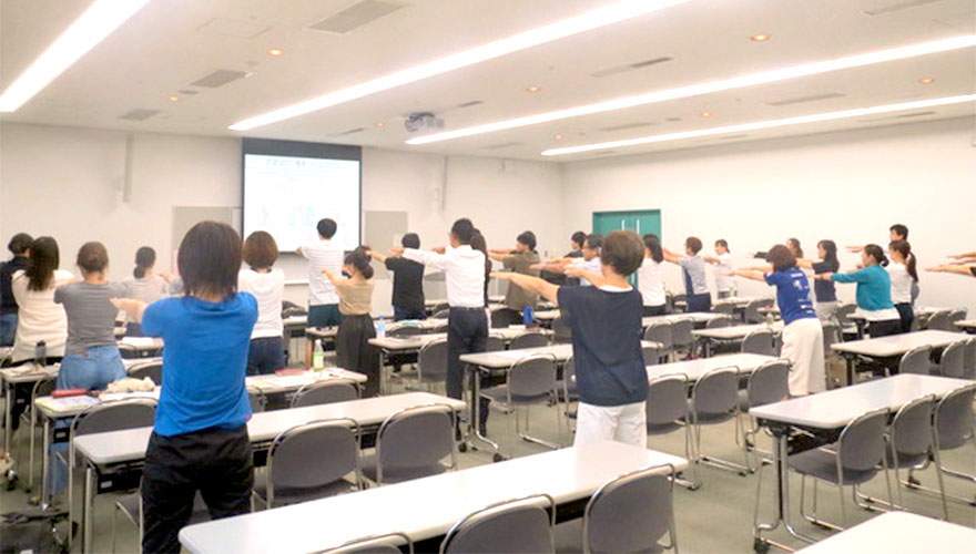 健幸アンバサダーになるためには、スマートウエルネスコミュニティ(SWC)協議会がカリキュラムを作成した「健幸アンバサダー養成講座」を半日受講します。今回は静岡県が主催し、県内の医療・保健関係の大学生を対象に健康づくりの基礎知識や筋力アップの方法、健康情報の伝え方などの講義や実技が行われました。