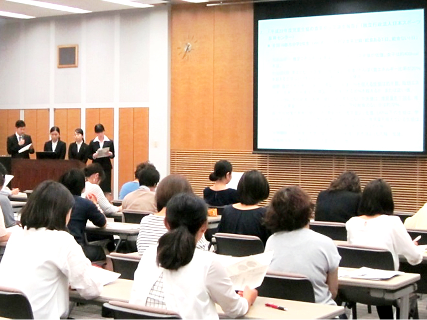 この報告会は富士市保健医療課食育推進室が主催し、富士市内の教育・保健・福祉分野で食育に関わる栄養士・管理栄養士、栄養教諭、学校栄養職員、養護教諭、保健師、幼稚園教諭、保育士が参加しました。富士市が2010年から2018年まで小中学生に実施してきた食事調査結果を統合解析した結果について、全国との比較、小学生の分析結果、中学生の分析結果の3テーマに分けて発表しました。