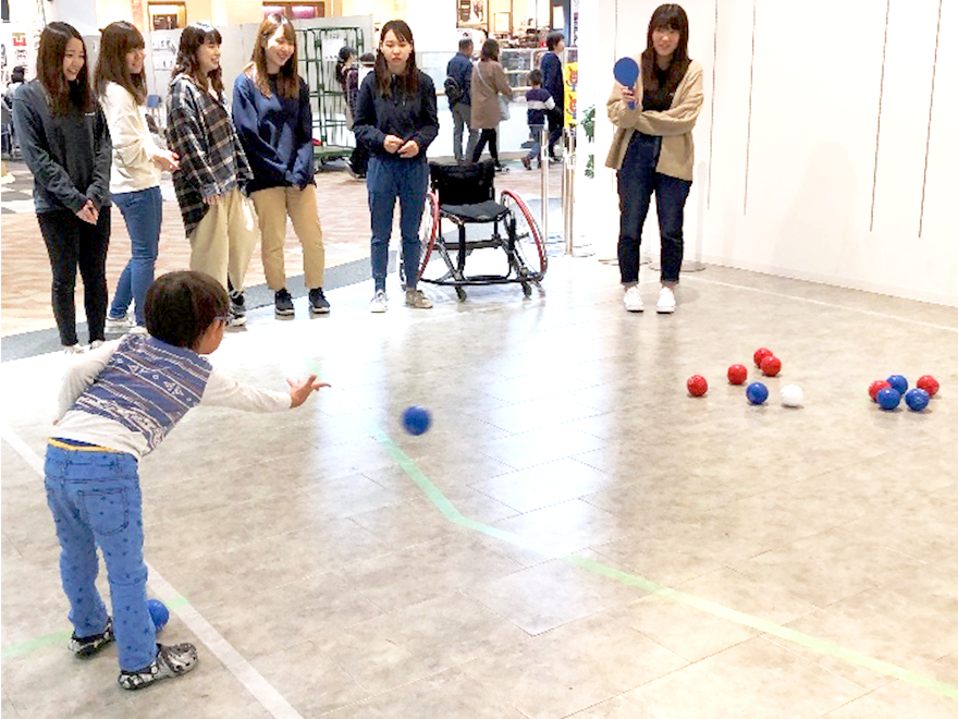 キッズイベントとして、センターコートでは、①出張こどもむら(こども健康学科/こボラ)、②ボッチャ(保健医療学部/障スポ★SC)、③ぴかぴかどろだんご(心身マネジメント学科/木村ゼミ)、④防災・減災かるた(心身マネジメント学科/木村ゼミ)⑤スーパーボールでツボ押し(健康鍼灸学科/SinQ)の5ブースを開きました。約550名の親子に参加していただき、地域の方々との交流を深めることができました。