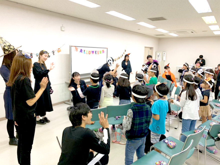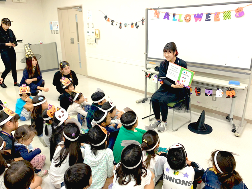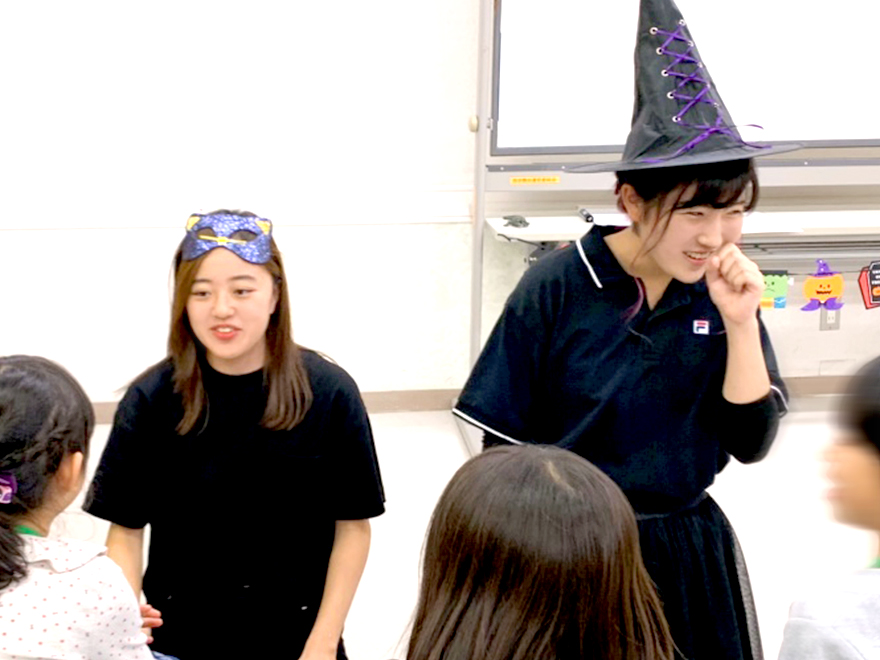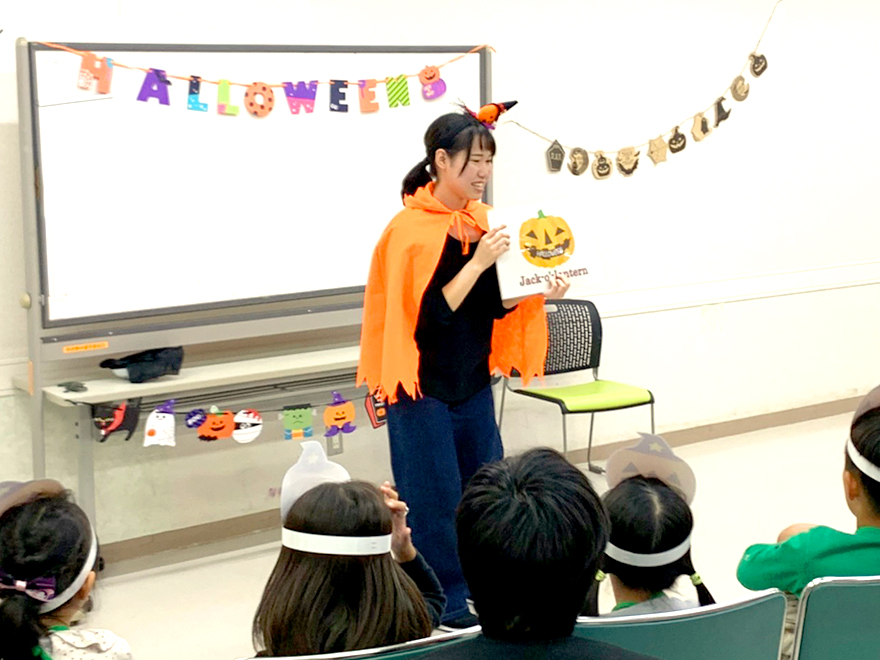 本学教育学部初等教育課程の有志学生が、小学1、2年生20名を対象にハロウィンにちなんだ歌を歌ったり、読み聞かせなどを行い、楽しい時間を過ごしました。