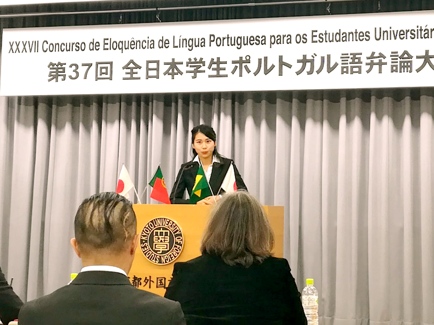 第37回全日本学生ポルトガル語弁論大会が11月23日(土曜日)に京都外国語大学で開催されました。7つの大学(京都外国語大学、天理大学、神田外国語大学、大阪大学、同志社大学、関西学院大学、常葉大学)から21名が出場し、本学からは外国語学部グローバルコミュニケーション学科3年生2名が参加しました。