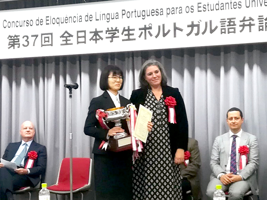 川村味奈美さんは「外国人と暮らすこと」(Viver com os estrangeiros)というタイトルで、「多文化共生」に関わる活動の経験について5分間のスピーチをおこない、横山結花さんは「ポルトガルの民謡音楽」(Música folclórica portuguesa)と題してポルトガルの国民的民衆歌謡であるファドについてスピーチをしました。川村味奈美さんは、その内容と適切な表現力が評価され、第2位となり、「京都外国語大学総長杯」を見事受賞しました。