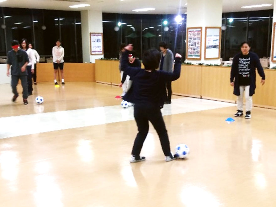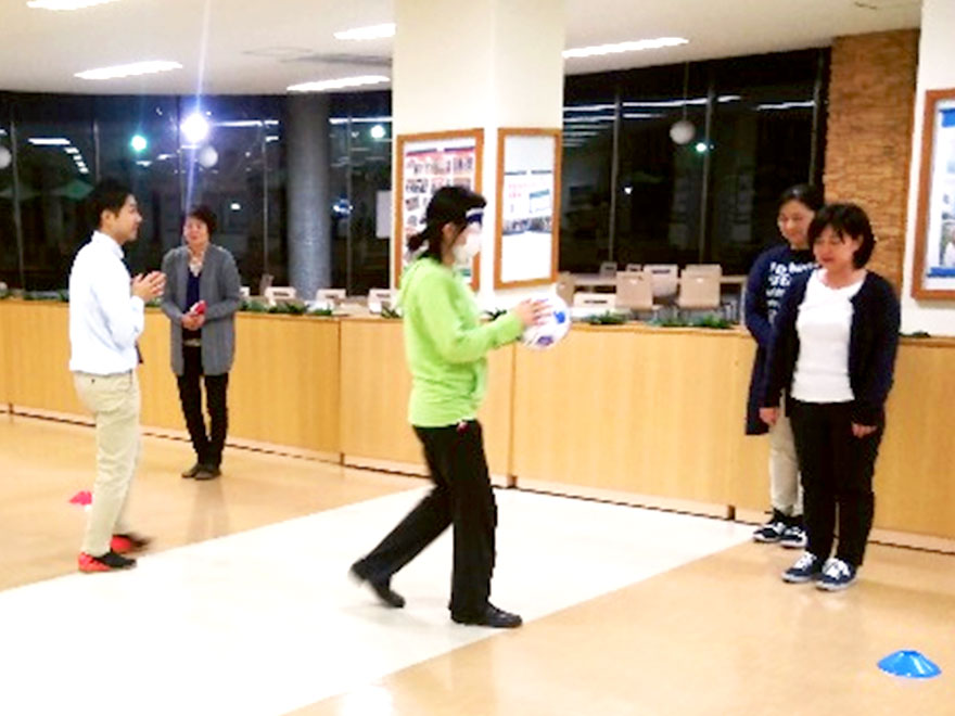 講義では、浜松市はマリンスポーツが盛んなことや、スポーツ庁がウォーキングを中程度の運動(スポーツ)として推奨していることなどが紹介された後、受講生全員で実際に目隠しをしてブラインドサッカーを体験しました。最初は恐怖心を感じる方が多くいましたが、周囲からの言葉掛けのサポートなどを通じて最後は楽しむことができました。受講生からは「限られた情報の中でパスやドリブルをする大変さは想像以上だった。健常者同様にパワフルな試合をするパラリンピックを見るのが楽しみになった」との感想をいただきました。