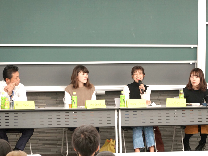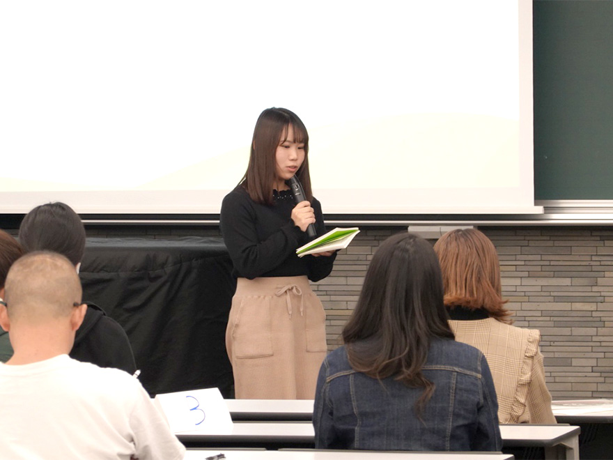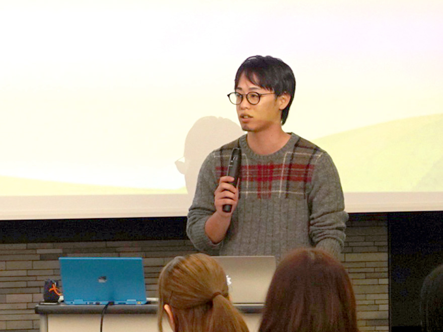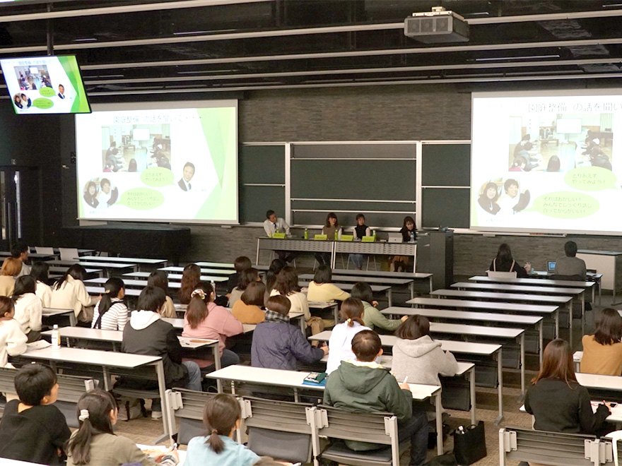 保育学部村上ゼミでは、プロジェクト「子どもと保育の未来空間」の一環として「保育広場2019」を企画しています。11月30日(土曜日)に、本学静岡草薙キャンパスにて今年度最後の保育広場を行いました。当日は、定員50名を超え、73名の学生・保育者が参加しました。今回の保育広場では、横浜市瀬谷区にある「鳩の森愛の詩瀬谷保育園」から園長の瀬沼幹太さんと保育者3名の方をお招きし「園庭改造を通じて、子どもの姿から改めて学んだこと」というテーマで講演をして頂きました。
