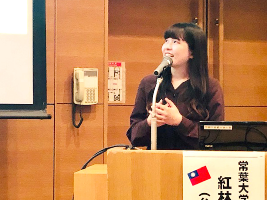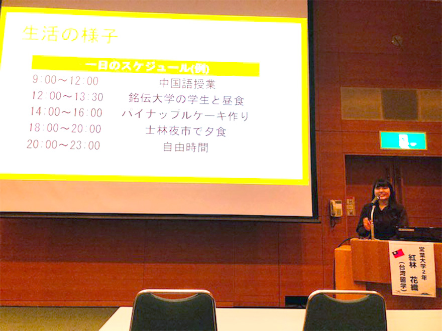 他大学の2名の留学経験者とともに登壇した紅林さんは、今後留学を考えている大学生・高校生を前に、日本人の留学先としての台湾の魅力や短期留学で伸ばせる力について報告を行いました。