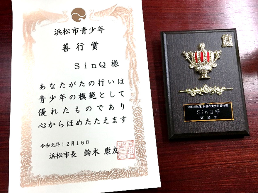 12月16日(月曜日)、健康鍼灸学科の学生が所属するボランティアサークル「SinQ」が浜松市から表彰され、善行賞をいただきました。善行賞は、浜松市が地域の文化活動や奉仕活動に積極的に取り組む青少年や団体をたたえ表彰しています。「SinQ」は7年前に発足し、浜松市を中心とした地域貢献活動や熊本県などの被災地で多くのボランティア活動を継続的に行っており、その功績が認められ今回の受賞となりました。今後も活動を継続し、地域社会に貢献できるよう、努力していく予定です。 関連リンク 健康鍼灸学科 健康鍼灸学科についてはこちら クラブ・サークル クラブ・サークルについてはこちら