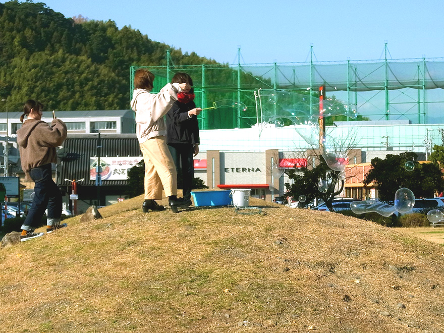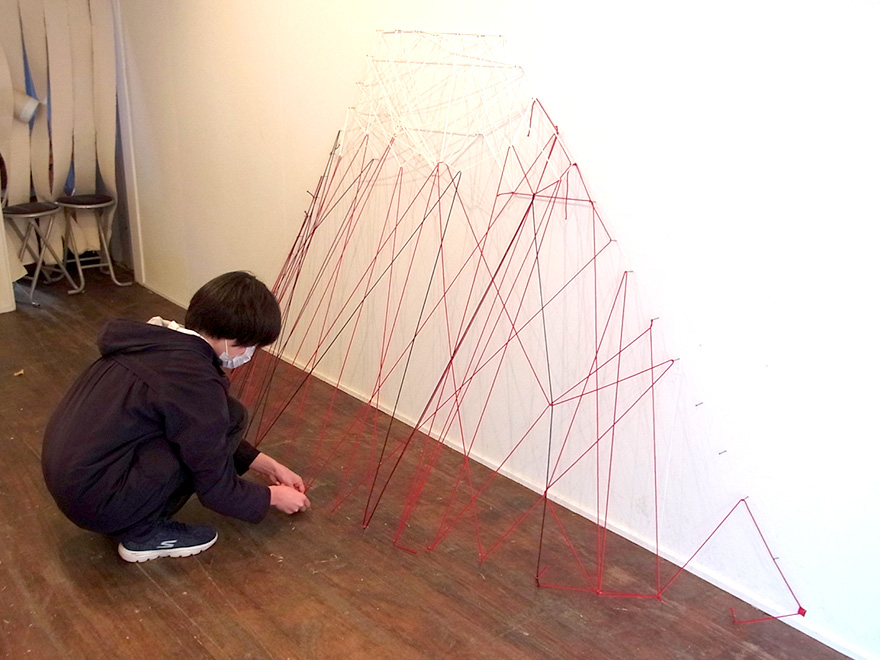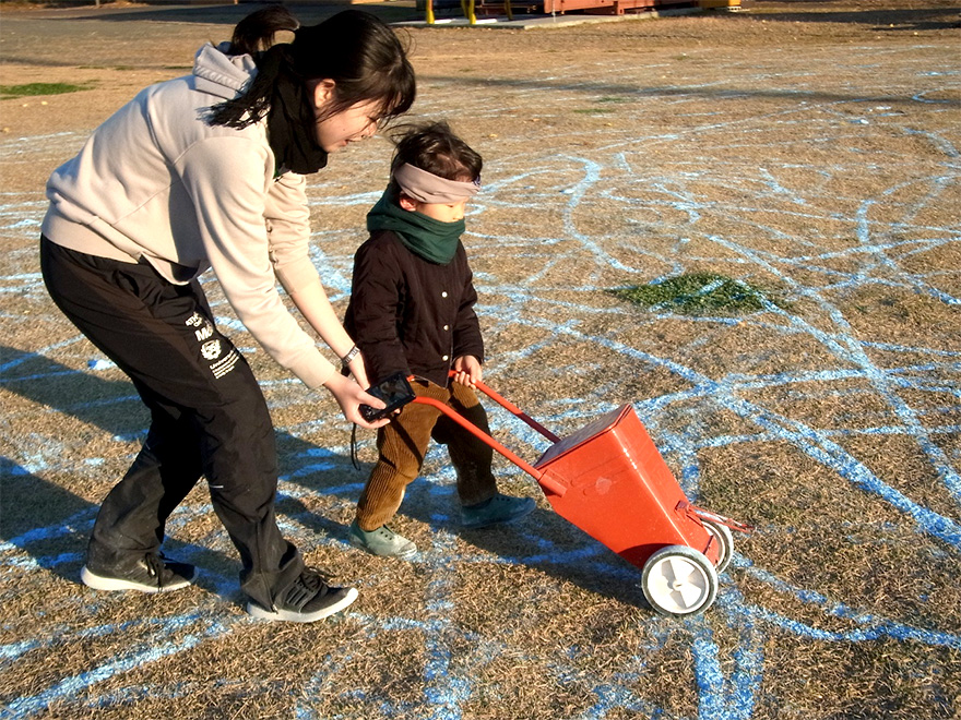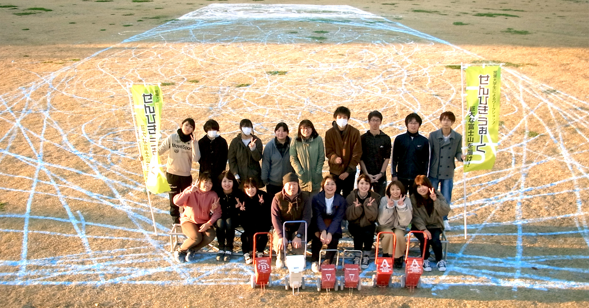 これは広い芝地にラインマーカーで線を引き、大きな富士山の絵(35×20m)を描くものです。また巨大シャボン玉を飛ばして、富士山にかかる雲や霞も表現し、さらにコンテナギャラリー内でも糸引きアートで富士山を描きました。広場に散歩に来た親子連れなど一般市民95名にも参加いただき、静岡市が目的とする公園のにぎわい創出に、学生たちが一役買いました。