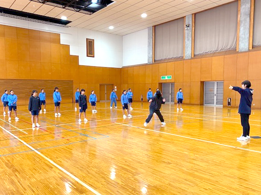 当日は、庄内地区のソフトボール部に所属する中学生18名が参加しました。将来、スポーツ指導者、スポーツトレーナーを目指す女子バスケットボール部員が、ストレッチやアジリティ(敏捷性)トレーニングなどを実践しながら素早く反応するための腕の振り方や足の動かし方などを指導しました。