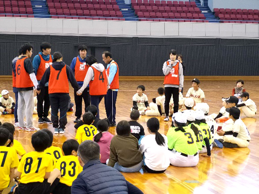 学生は、異なる少年団の子同志が交流できること、保護者も参加してもらうことを意識して9つのゲームを企画、学生1人1人がリーダーになり、やり方を説明したり、見本を見せたりしました。学生らは、声をしっかり張り、丁寧な説明と動き、誘導をしました。参加学生と子どもたちはすぐに親しくなり、時には一緒にゲームを楽しみ、地域の子どもたちや保護者との交流を深めました。
