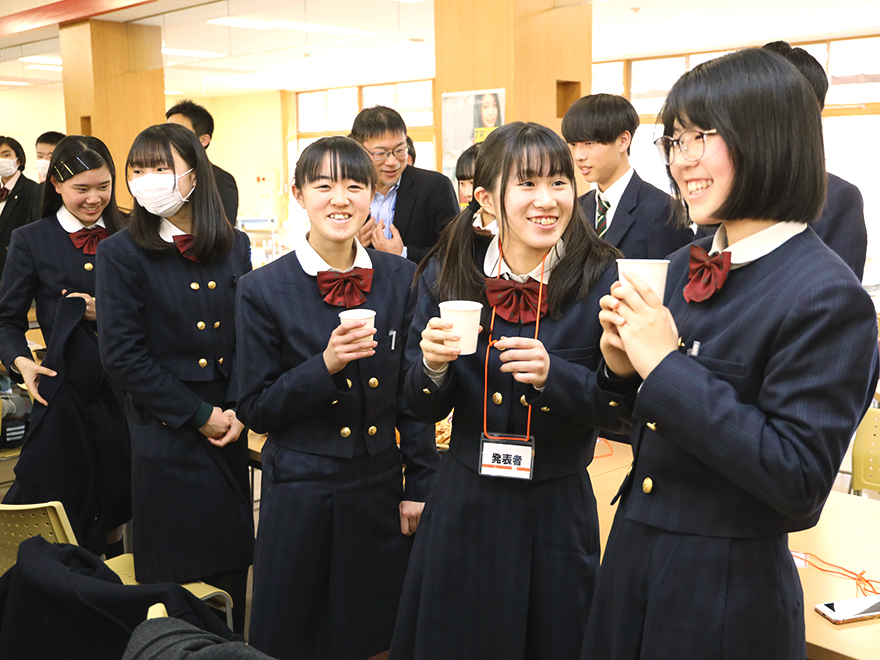 表彰式終了後、今回初めての試みとして、学食で参加者全員(発表者・引率教員・応援生徒・大学教員・学生スタッフ・一般)による交流会を行いました。ジュースで乾杯の後、1次審査を担当した大学教員、発表チーム、高校の先生、スタッフの大学生から短時間のスピーチをしていただきました。特に印象に残った話題は、伊豆総合高等学校土肥分校の「全校生徒が30人で2年生は5人。私はその5人の中の1人」という話や、市立沼津高等学校Teachersの「自分たちのクラスは先生になりたい人が集まったクラス」「このコンテストの作品づくりを通じてクラスがすごく団結した」という話でした。