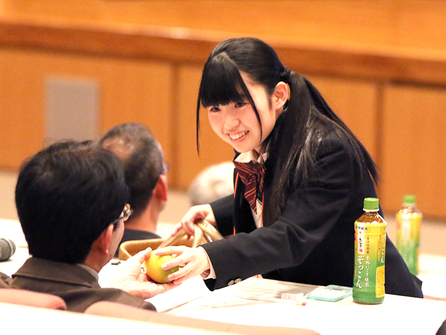 「ビジネスプランの部」グランプリに輝いた韮山高等学校写真報道部の発表は、伊豆半島の人口が今後25年で約4割減少することに対する危機感を出発点にして、地元の宝を「歴史」「ひと」「自然」の観点から洗い出し、地域活性事業につなげたものでした。すでにこの事業を実践している点が高く評価されました。準グランプリを獲得した浜松学芸高等学校社会科学部地域調査班は、1991年から牛肉とオレンジが貿易自由化されたこと、さらに高齢化によってみかん農家が減少していることを端緒にして、果樹園芸で出る摘果(間引き)みかんを甘露煮にし、その果実やエキスを商品化する提案でした。