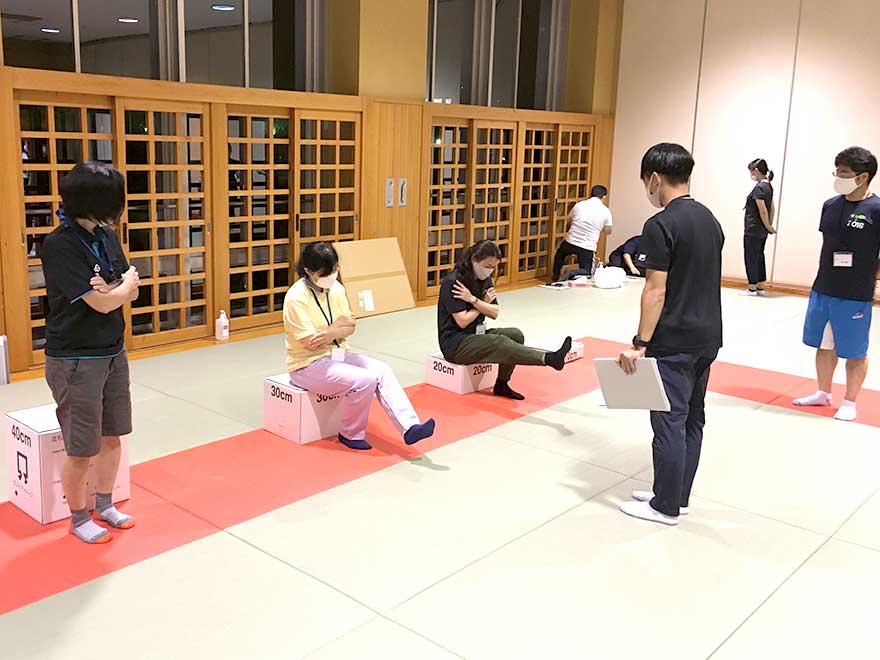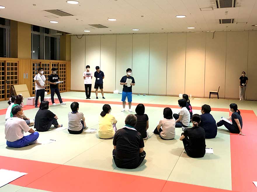 本講座は今村准教授に加え、教育学部黒岩准教授、富田非常勤講師が講師を務め、教育学部生涯学習学科の学生が運営補助に参加しております。体力測定時には、受講者は学生の説明に耳を傾け、和やかな雰囲気で楽しみながら運動する様子がみられました。
