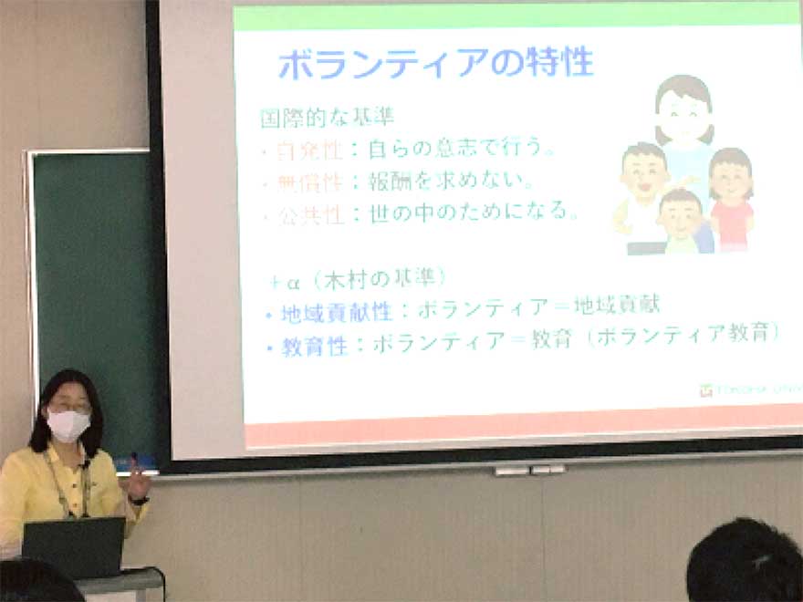 9月15日(火曜日)に、第1回研修を兼ねたオリエンテーションが行われ、心身マネジメント学科を中心に多くの学生が参加しました。まず、事務局から、本プロジェクトの趣旨や活動方法、級認定に至るまでの流れ等の説明があり、社会貢献・ボランティアセンター長の木村佐枝子准教授が、ボランティア活動の意義・心構えやNG事項、ボランティア実践例、とこは人材育成プロジェクトの概要等について解説しました。第2回研修は9月29日(火曜日)に行われます。木村准教授は「HUVOCを有効に利用して、ボランティア活動に打ち込んでほしい。」と学生たちにエールを送りました。