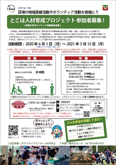 日頃の地域貢献活動やボランティア活動を公的に評価する「とこは人材育成プロジェクト」が始まりました。これは、活動内容や時間に応じて、静岡県教育委員会が主催する「静岡県青少年指導者級別認定事業(初級および中級)」に認定されるというもので、今年度で2年目となります。