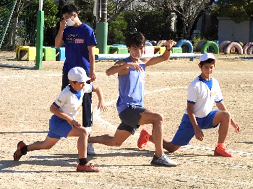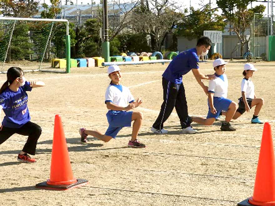 10月30日(金曜日)、常葉大学に事務局をおくオリパラ教育浜松市内大学連携協議会の依頼を受け、本学陸上サークルの学生3名が浜松市立花川小学校で「けがをしないで楽しく走る」というテーマで走り方の指導をしました。