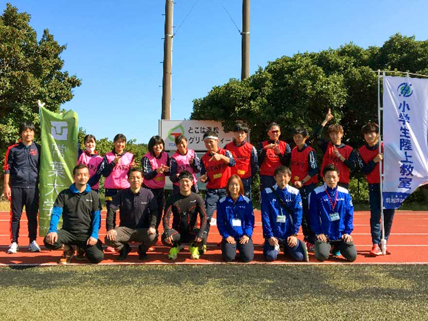 指導に当たったのは陸上競技部の10名。将来、保健体育の教員を目指す心身マネジメント学科の学生が中心となり、参加した児童78名をグループ分けして指導にあたりました。