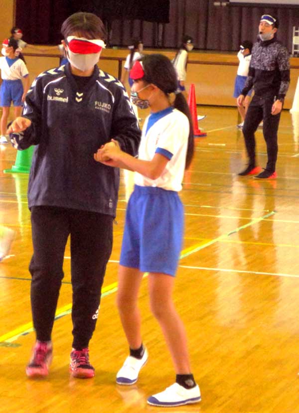 児童たちはブラインドサッカーの内容やルールを学んだあと、2人1組で、見本となる学生を見ながら、一人がアイマスクを付け、もう一人がサポート役となり目的地まで行くという取り組みを行いました。実際のブラインドサッカーでは、サポート役をガイドと言い、フィールド内の選手にボールの位置、相手選手との距離やゴールの方向などを指示する役を行います。参加した学生は時には児童の相手になったり、時には声掛けをしながら児童にアドバイスをしていました。最後は4人1組で、実際のボールを使い体験しました。まず、ガイド役と選手役に分かれた学生が見本を見せました。学生は慣れた様子で上手にこなしましたが、実際に行った児童たちはなかなかボールを取ることができず、指示の正確さや阿吽の呼吸の大切さを体験し、ガイドの難しさを知りました。