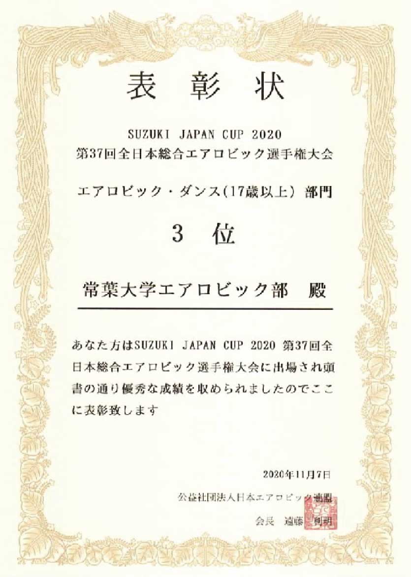 11月7日(土曜日)「スズキジャパンカップ2020 第37回全日本総合エアロビック選手権大会 全国大会」が東京都大田区総合体育館で行われ、エアロビック部が3位入賞を果たしました。