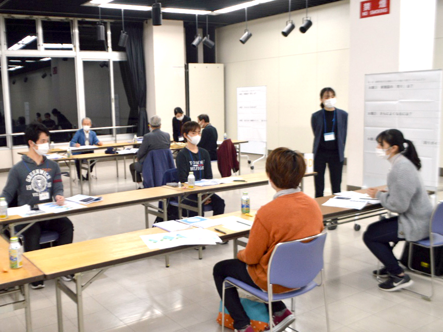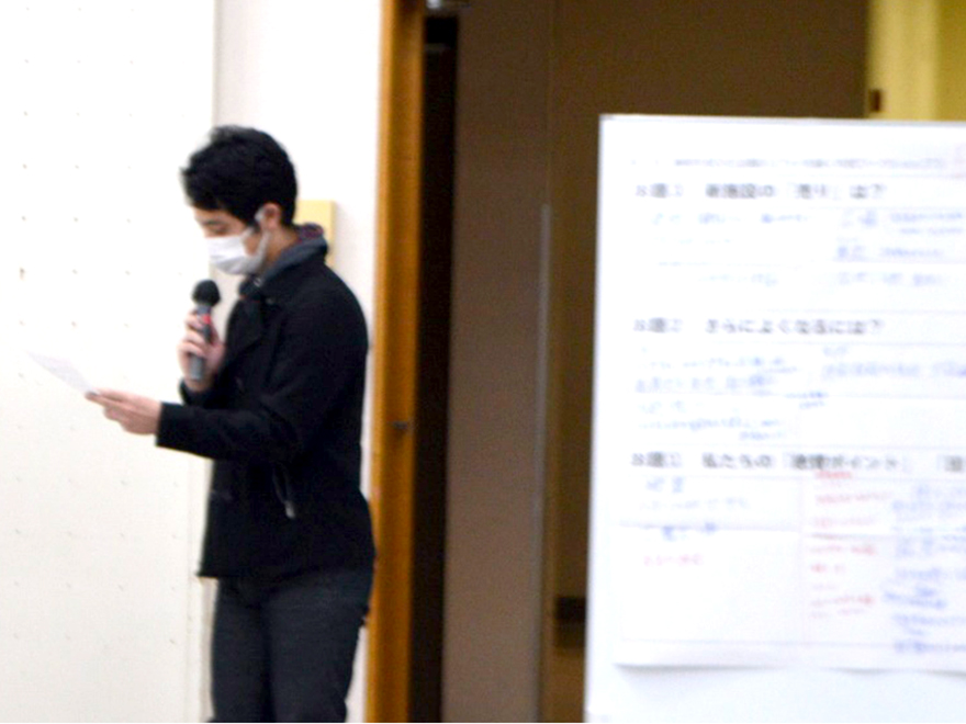 11月12日(木曜日)の第1回は、改修案の「絶賛ポイント・困りポイント」を洗い出し、「さらに良くなるには」を考え、「新施設の売り」の検討を行いました。4名の学生は積極的に発言し、様々な年代の方と熱心な意見を交わしました。