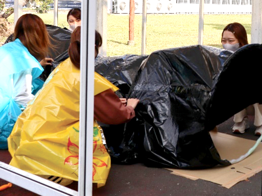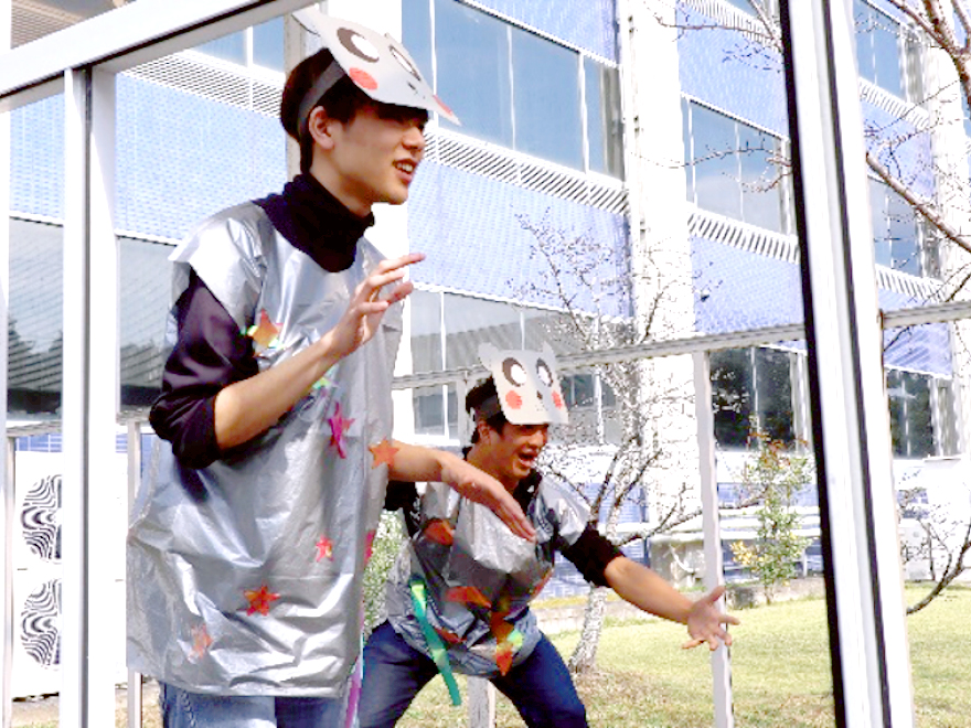 今回は、みんなでキャンパス内を移動しながらお話の世界を体験する移動劇を行いました。地球侵略にやってきた宇宙人を追い払おう!という設定で、学生たちは宇宙人に扮し、参加した子どもたちと外遊びを楽しみました。