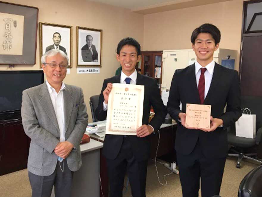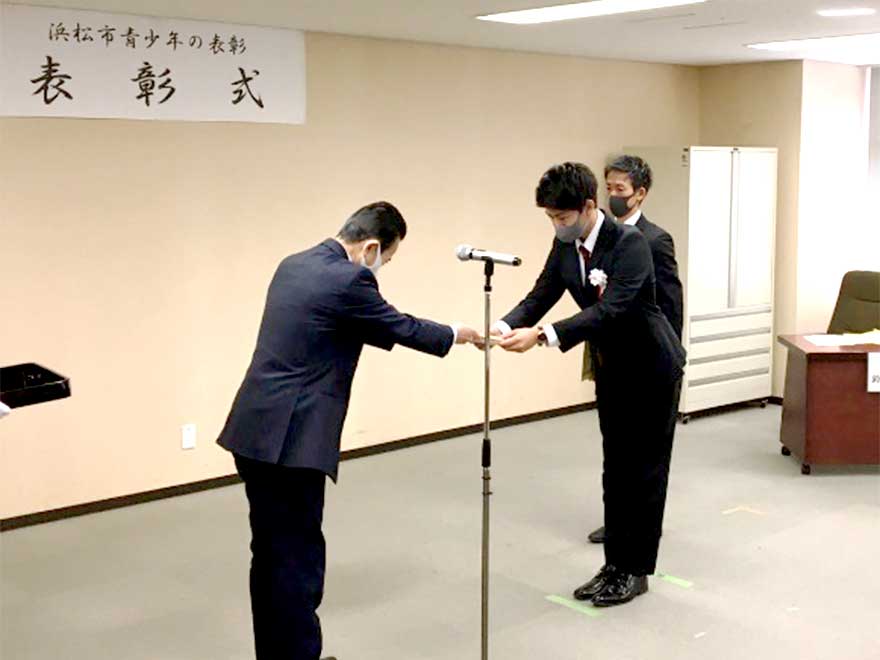 表彰式で鈴木浜松市長は「皆さんの活動は若者の模範となる活動です。賞を励みにさらなる活躍に向けて頑張ってほしい」とエールを送りました。受賞したサークル代表の寺田一成さん(心身マネジメント学科4年)は「先輩方の活動を引き継ぐ形で取り組んできた。先輩方に感謝し、後輩たちには今後もこの活動を引き継いでいって欲しい」と語りました。