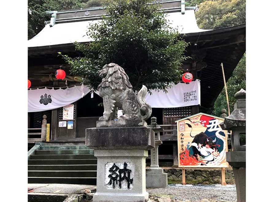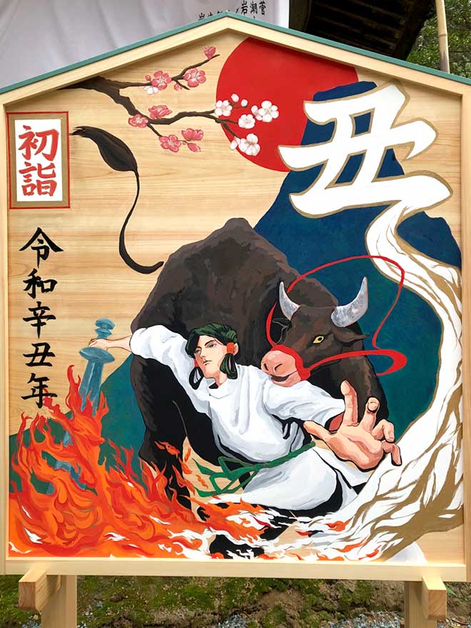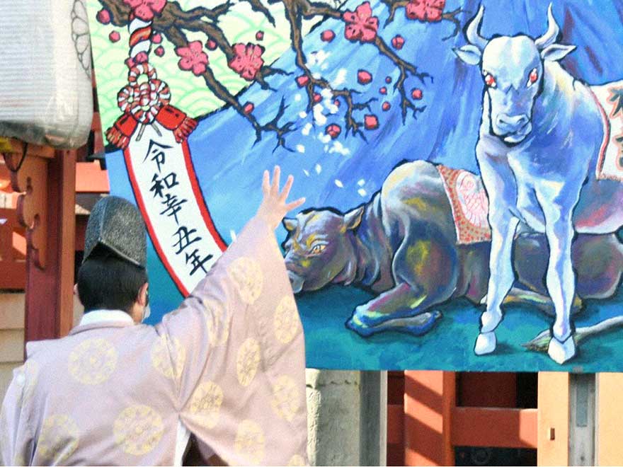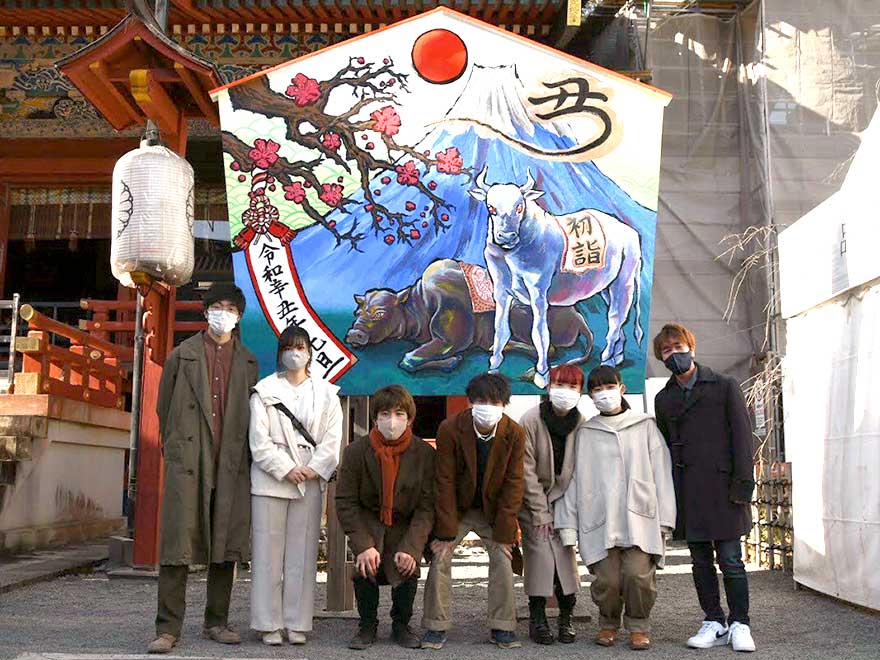 年末年始にかけて静岡市葵区の静岡浅間神社に、令和3年の干支「丑(うし)」の大絵馬が設置されました。これは造形学部による地域貢献活動として今年で9年目になります。大絵馬の大きさは高さ3メートル、幅2メートル半です。合津ゼミの活動の一環として、2年生のゼミ生等9名が11月中旬よりデザインを考え制作しました。令和3年は、「辛丑(かのとうし)」です。辛いことに幕を下ろし、希望へ向かう年になると言われています。コロナ禍を克服し、明るい年になるようにという思いを、「忍耐」を表す黒牛、「希望」を表す白牛を中心に、信仰対象の富士山、縁起の良い紅白梅花、「丑」の文字を象った金雲などをデザインし、鮮やかな色調で描きました。マスク着用と「三密」を防ぎながらの制作は、例年と違い苦労と手間がかかりましたが、達成感は一入でした。