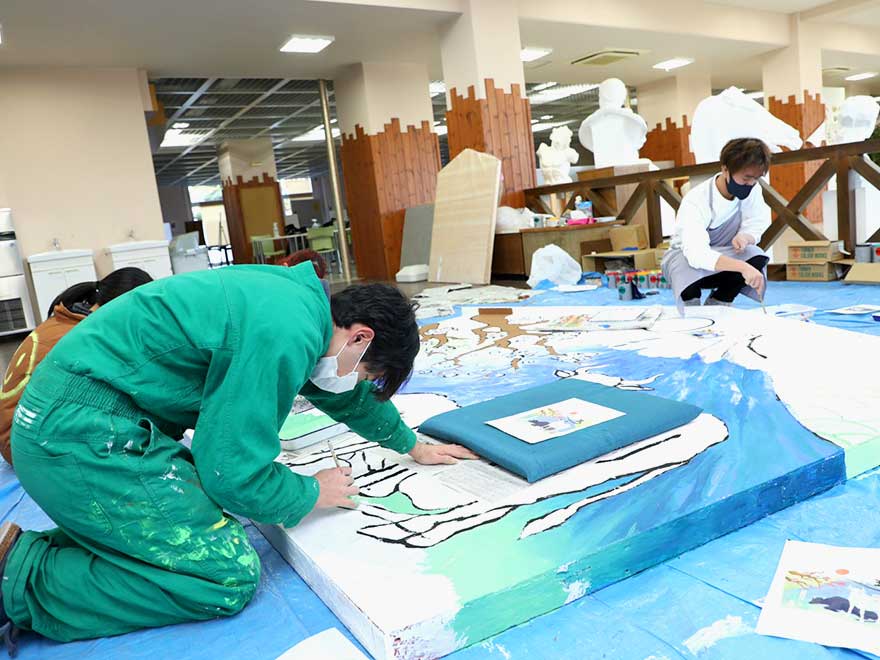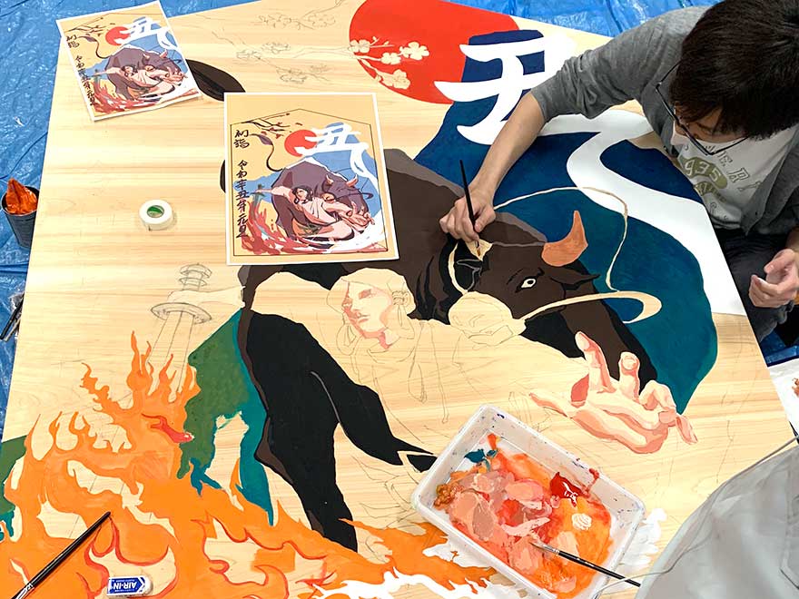 また、今年より静岡市清水区の草薙神社より大絵馬制作のご依頼を頂きました。絵馬制作に係わった有志は、本年度入学したばかりの1年生17名です。今年度の1年生は、入学式の中止から始まり、オンライン授業、大学祭の中止などコロナ禍により様々な制限がありました。その中で、頂いた今回のご依頼は、学生にとって楽しく有意義な時間を過ごせたと共に、達成感を抱くことができました。大絵馬は、草薙神社ということで、古事記に登場するヤマトタケルと草薙の剣にまつわる話を表現し、ヤマトタケルが草薙の剣によって迫る炎を切り裂く場面を迫力と威厳が伝わるように描きました。草薙神社の特色と辛丑年を、我が国の新しい文化である漫画・アニメ的な表現により、世代を超えて伝わるデザインとなっています。