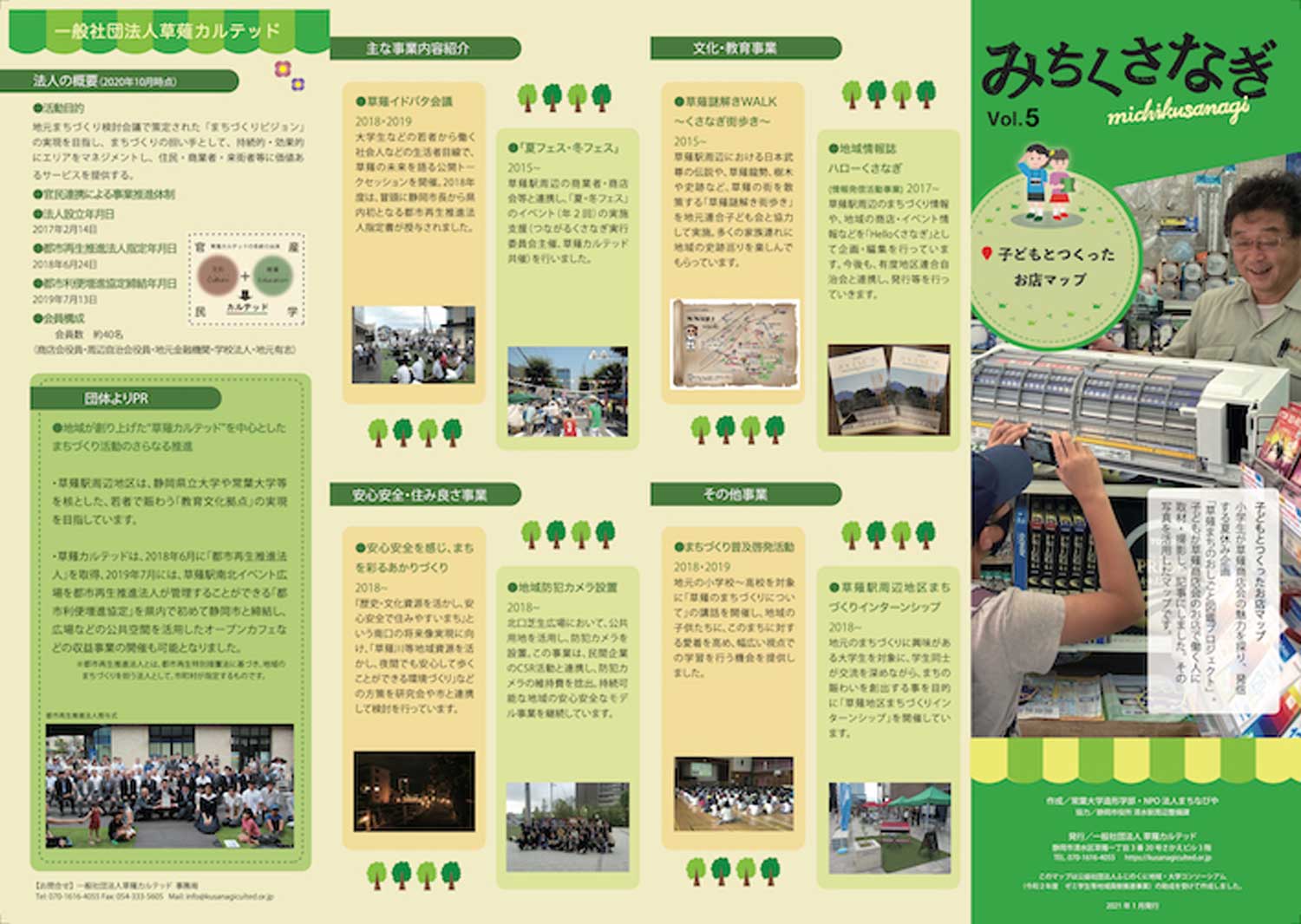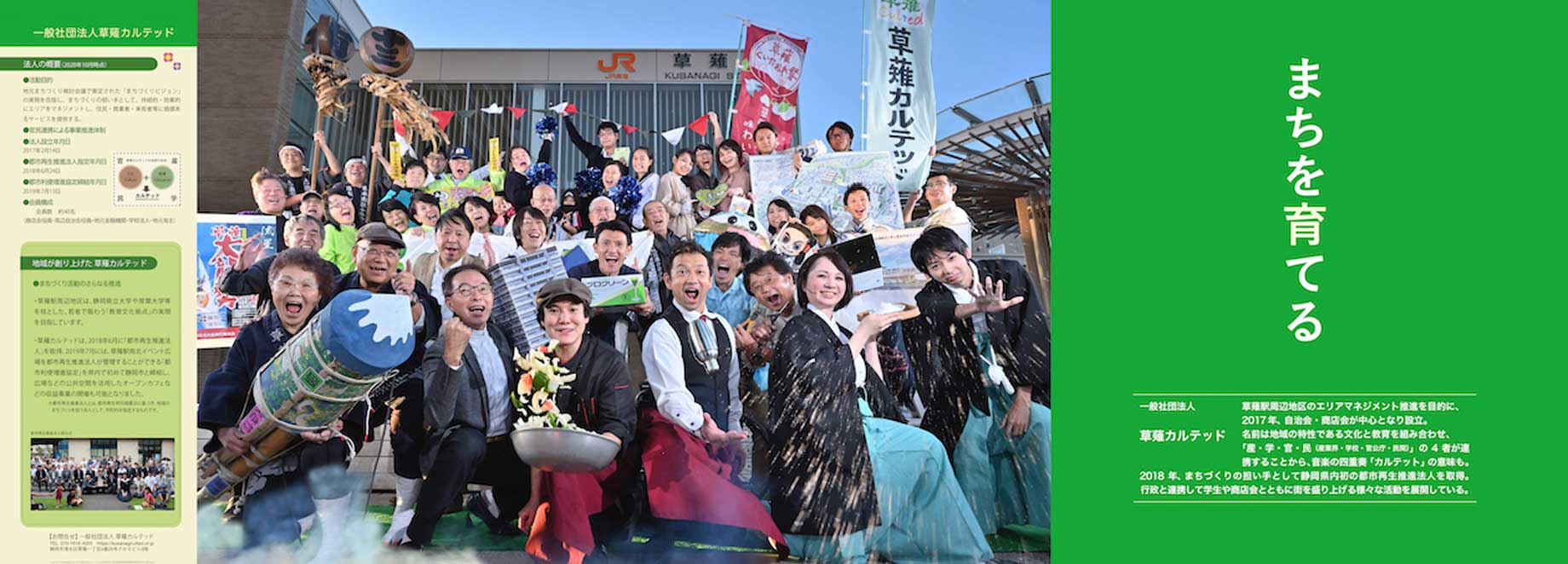 「草薙カルテッド」とは、草薙のまちづくりを担う社団法人で、地域の自治会、商店会、大学等で構成されています。静岡県下第一号の都市再生推進法人でもあります。この存在と活動を広める課題を静岡市から指定され、ふじのくに地域大学コンソーシアムのゼミ学生等地域貢献推進事業を受けて取り組みました。