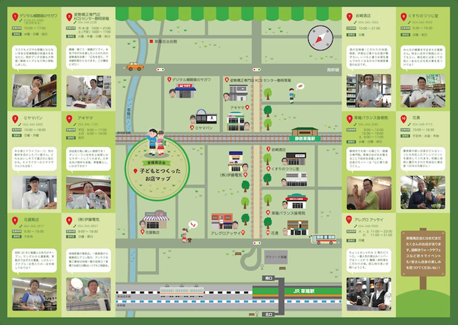 マップはNPOまちなびやと協力し、「子どもとつくったお店マップ」と表裏になったもので、地元や関係機関で配布されています。ポスターは写真家 杉山雅彦さんの撮影したモンタージュ写真と紹介文を組合せ、草薙駅北口の掲示板に張り出されています。