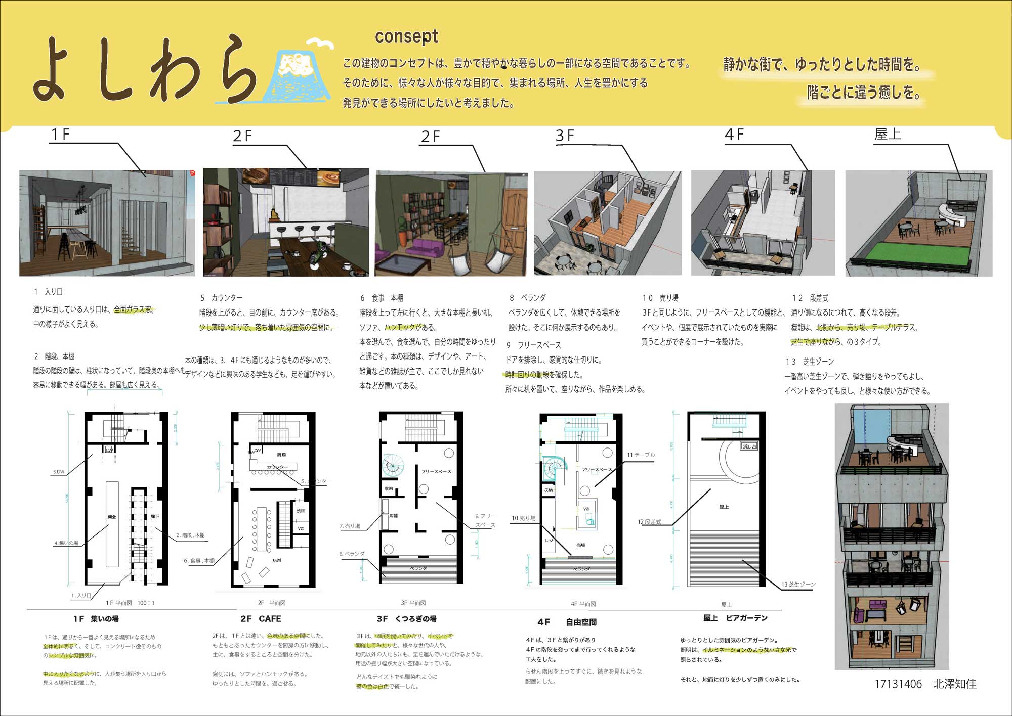 富士市の吉原商店街には1960年代に「防災建築街区」として整備された、鉄筋コンクリート造のビルが並んでいます。この共同ビルを再生・活用し、新たな価値を吹き込もう、という提案です。近年、リノベーションという言葉が一般的になり、今ある建物を改修し、使い続けることの魅力が浸透してきました。時間を経た建物だけがもつ、新築では味わえない雰囲気を楽しむ建築のあり方です。