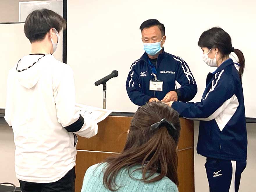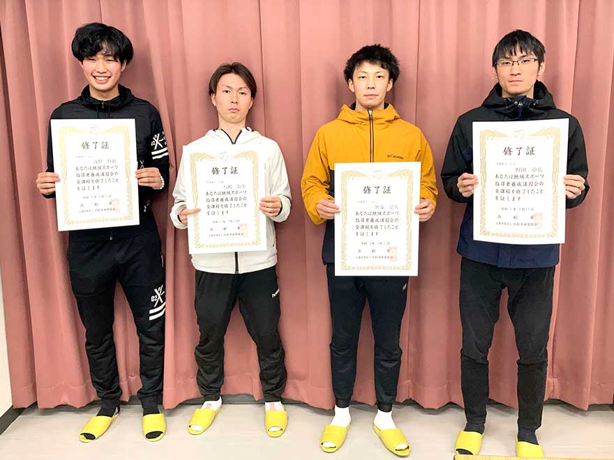 2月17日(水曜日)、浜松アリーナ研修室で、「令和2年度 浜松市スポーツ指導者養成講習会修了式」が行われ、健康プロデュース学部健康柔道整復学科の4名が修了証を授与されました。