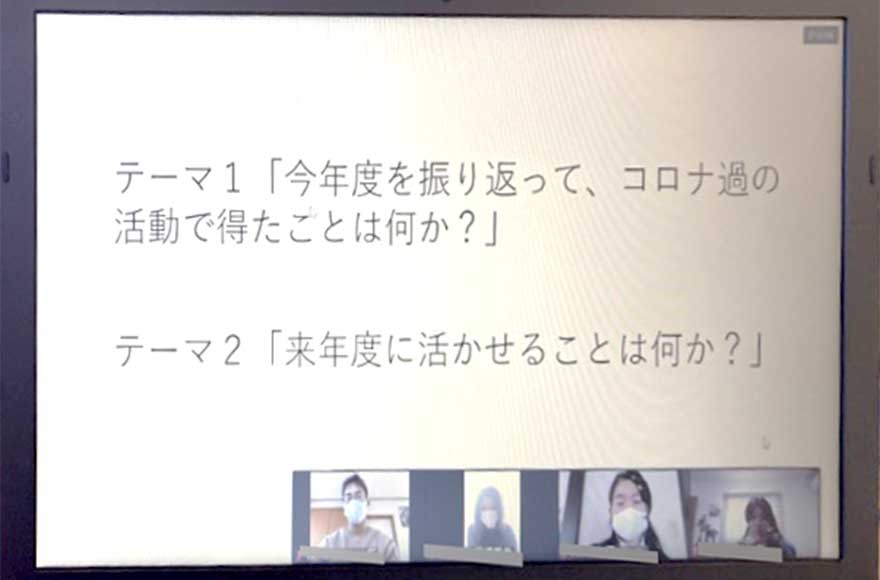その後、学生個人や団体の交流を深めるため、Zoomを使用したグループディスカッションを実施。参加した学生26名は、5グループに分けられ、「コロナ禍の中の活動で得たことは?」と「来年度に活かせることは何か?」について話し合いました。