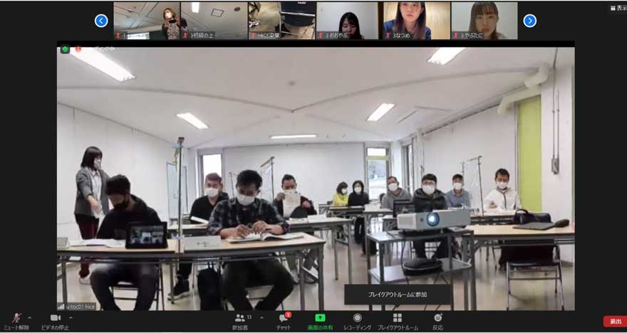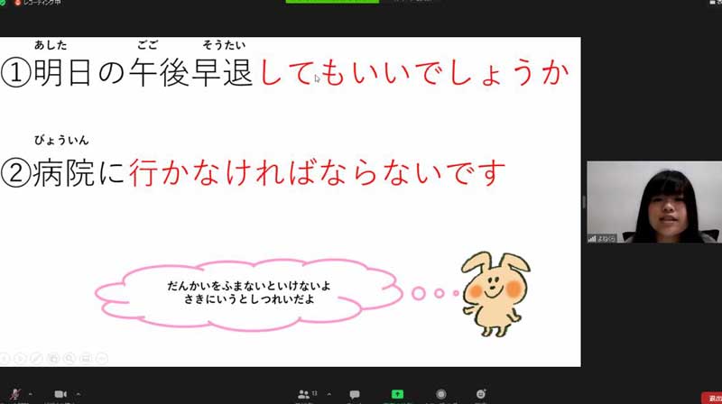 3月7日(日曜日)、(公財)浜松国際交流協会が主催する浜松市天竜地区の日本語教室の8名の外国人(インドネシア人、ベトナム人、タイ人)に対して、本学の学生がオンライン(Zoom)にて日本語授業を行いました。当日教師役を務めたのは、外国語学部の2名の大学生(2年生)で、会社勤めの多い学習者が現場で必要となる「許可を得る」という機能が果たせるよう、「~てもいいですか」を取り上げ、会話練習をしたり休暇届の書き方を教えたりしました。当日は、その他にも4名の大学生が参加し、ブレイクアウトルーム(オンライン上のグループ学習)にて学習項目の発展会話練習を行い、学習者の日本語学習のサポートをしました。