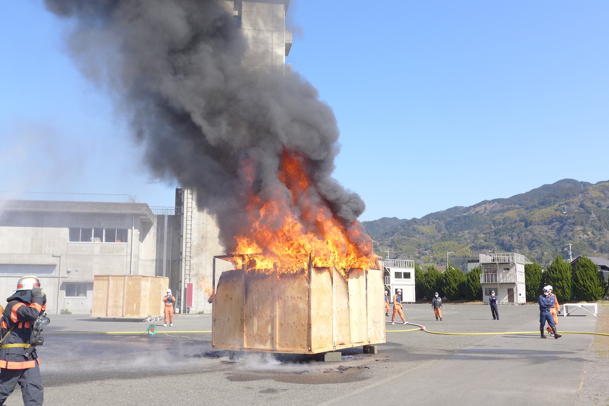消防学校は消防職員・消防団員の教育訓練機関で、今回の模擬家屋は、火災の出火原因を調査する実習のために使われました。実際の生活空間のように設えてから着火し、その後5分程度で大きな炎が上がり、火災の恐ろしさを実感しました。
