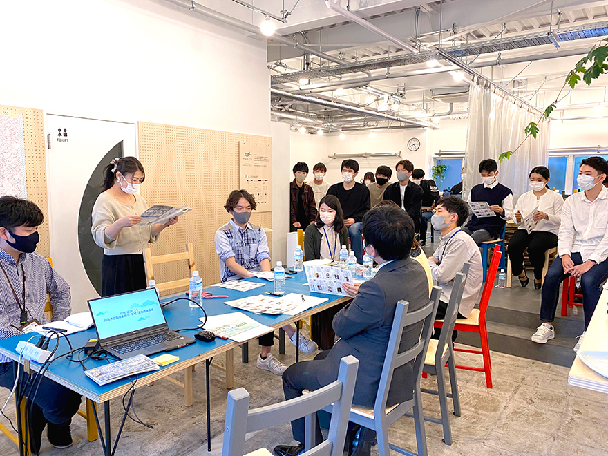 当日は、小豆川准教授が全体の趣旨、静岡市が推進するテレワーク、移住・定住促進事業を紹介し、本プロジェクトの活動の位置づけを説明した後、代表として坂井媛香さん、大石唯斗さん、良知幸都さんが、各飲食店・サービスのお薦めポイントを紹介し、ゼミ長の伏見拓哉さんが、取材後の感想と課題、地域への提言を発表しました。