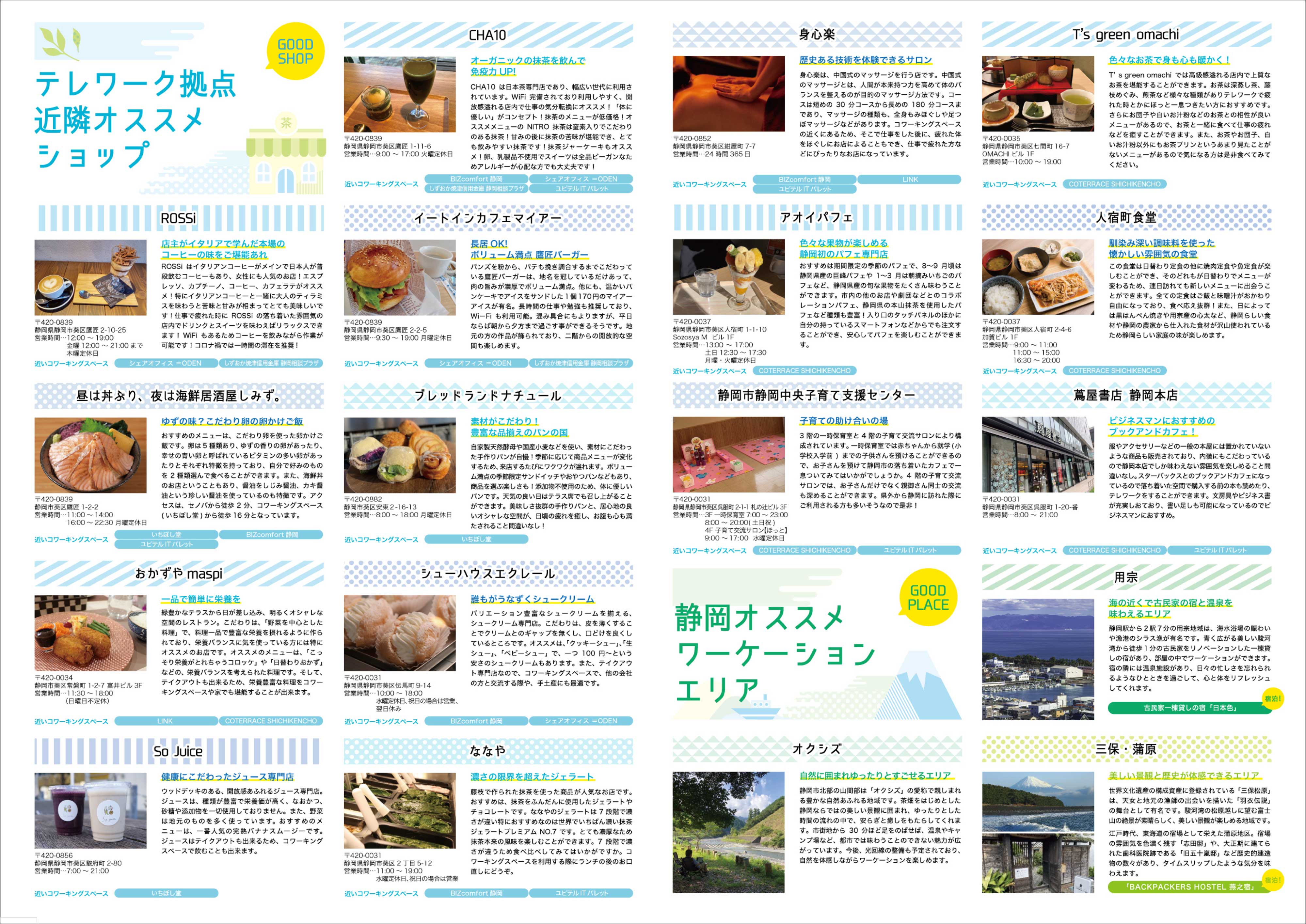 『2021年版 静岡市まちごとテレワークマップ』制作にあたっては、静岡市における鷹匠・安藤エリア、静岡駅・青葉公園エリア、七間町・人宿町エリアの飲食・サービス業14件および静岡中央子育て支援センターのご協力をいただきました。
