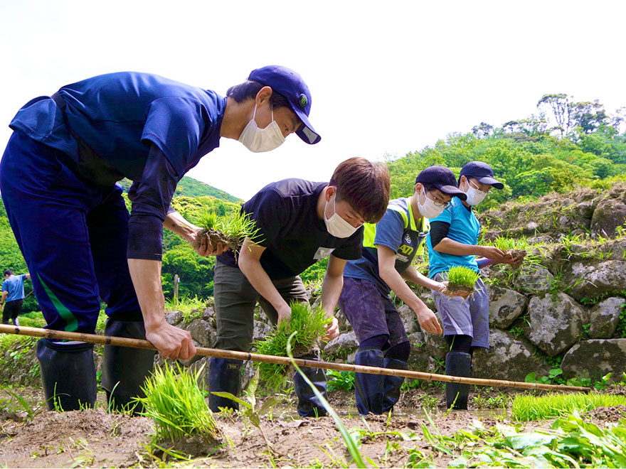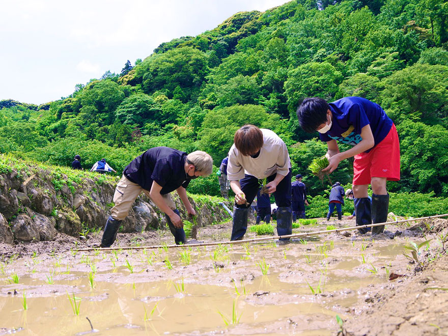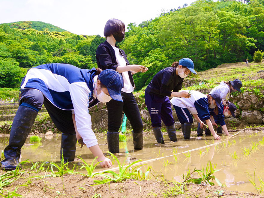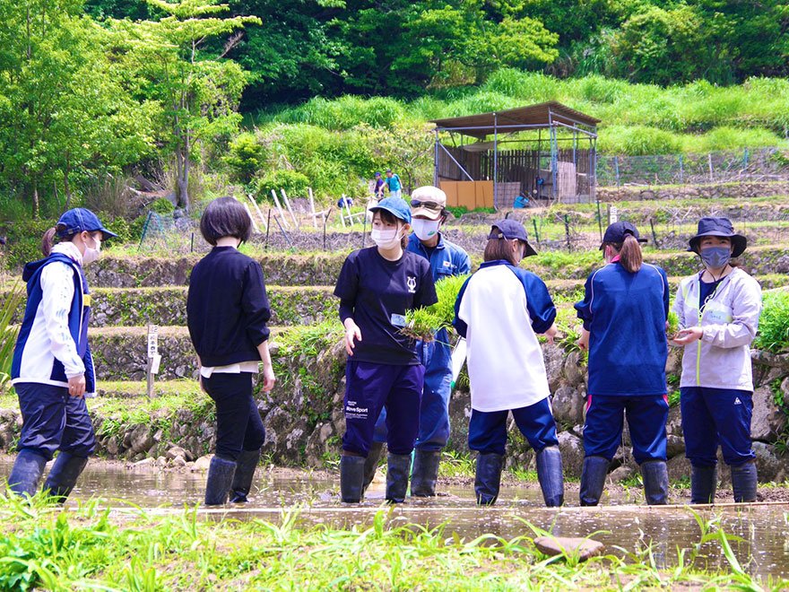 5月15日(土曜日)に本学社会環境学部の学生33名が、地域連携事業として、静岡県賀茂郡松崎町石部地区にある「石部の棚田」にて行なわれた田植え祭りに参加しました。昨年度はコロナの影響により中止となってしまったため、2年ぶりの参加です。