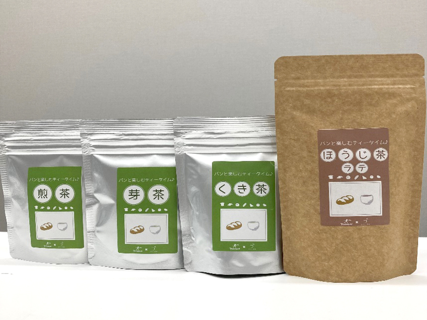 具体的には「パンに合うお茶!」というコンセプトのもと、「煎茶」「芽茶」「くき茶」「ほうじ茶ラテ」という4種類の商品ラベルと売場におくPOP制作に参加しています。