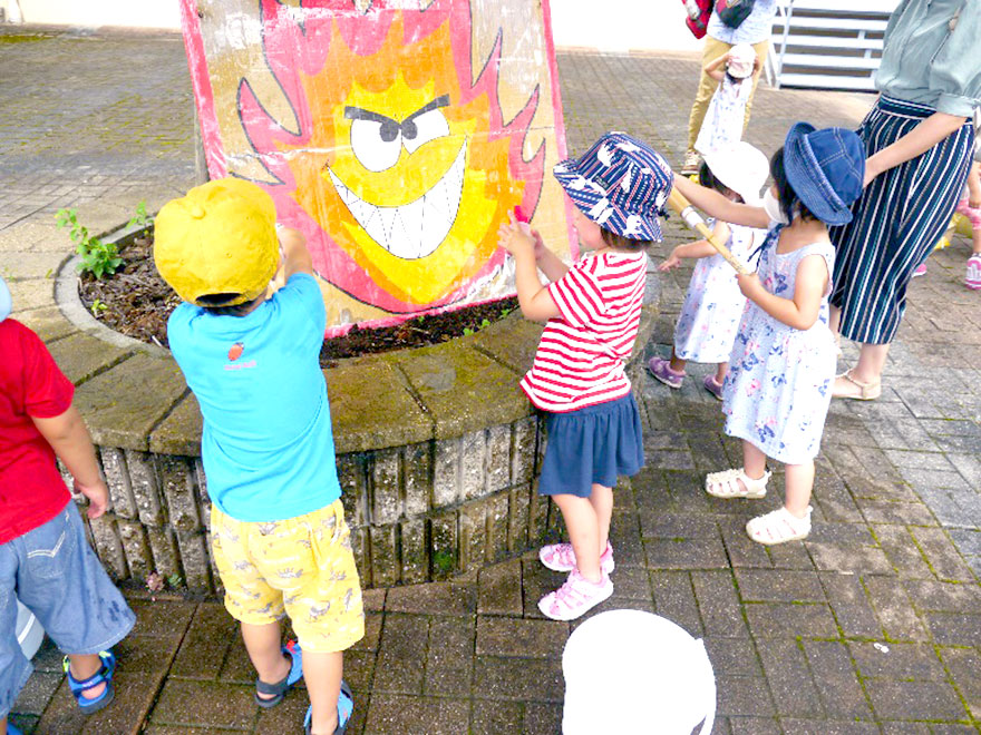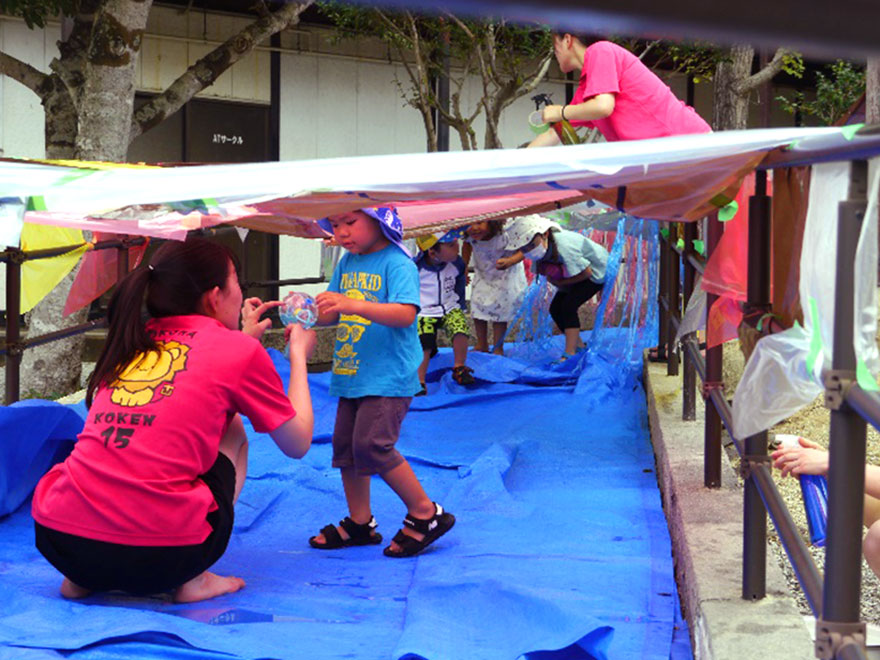 今回は「みずあそび、しよう!」をテーマに、1年生による水遊びのオープニングパフォーマンスからはじまりました。続けて、2年生、3年生の計画した水鉄砲づくりやプールでのおもちゃ拾い、ミストのトンネル、水の流れる滑り台でのヨットレースや魚釣りなどを楽しみました。子どもたちはこれらにとらわれないさまざまな水遊びを展開してくれました。