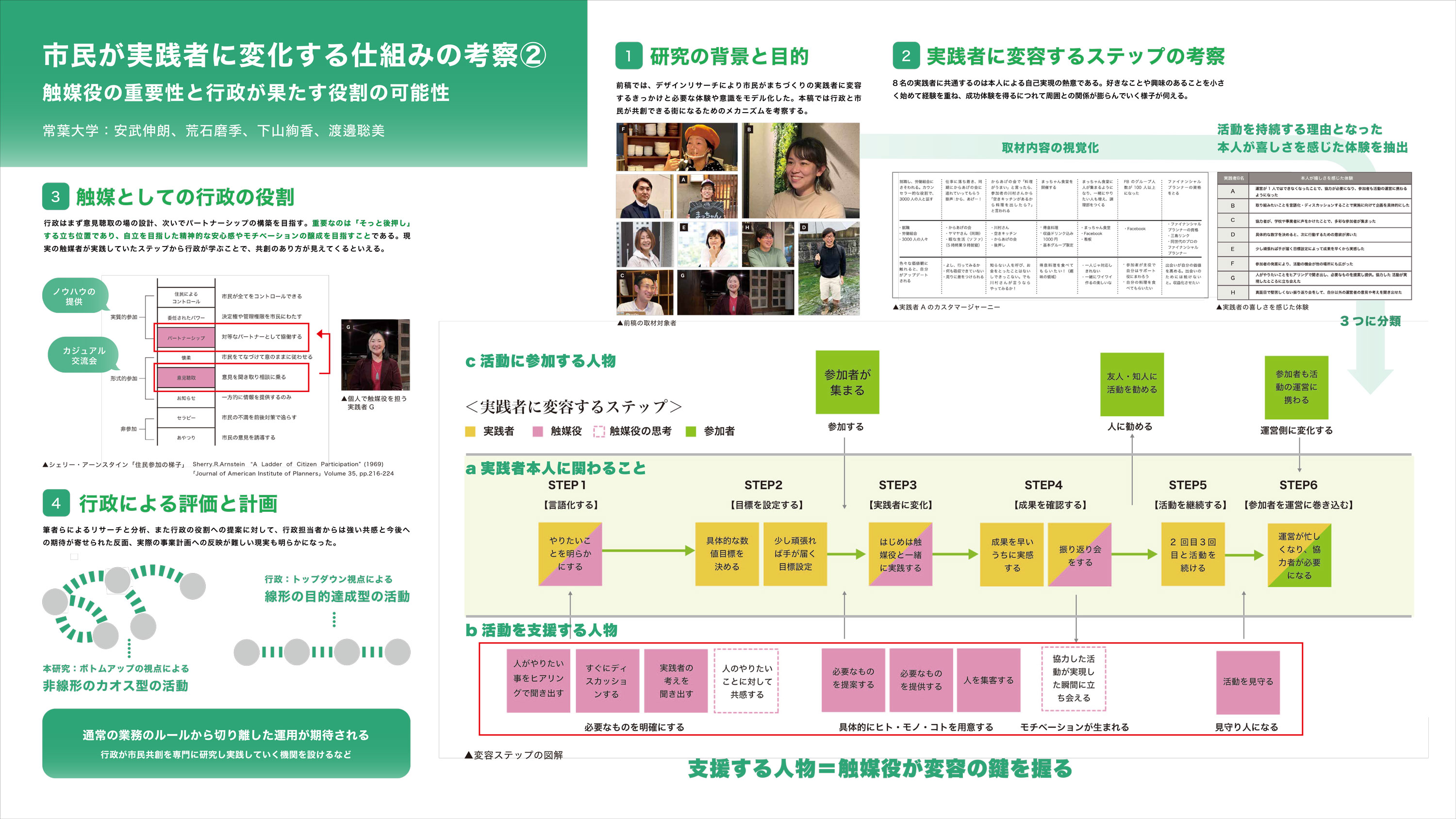 | 「市民が実践者に変容するしくみの考察①、②」 | 渡邊聡美、荒石磨季、下山絢香、安武伸朗 |