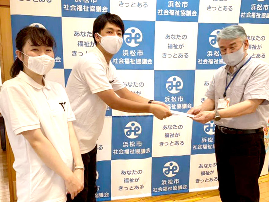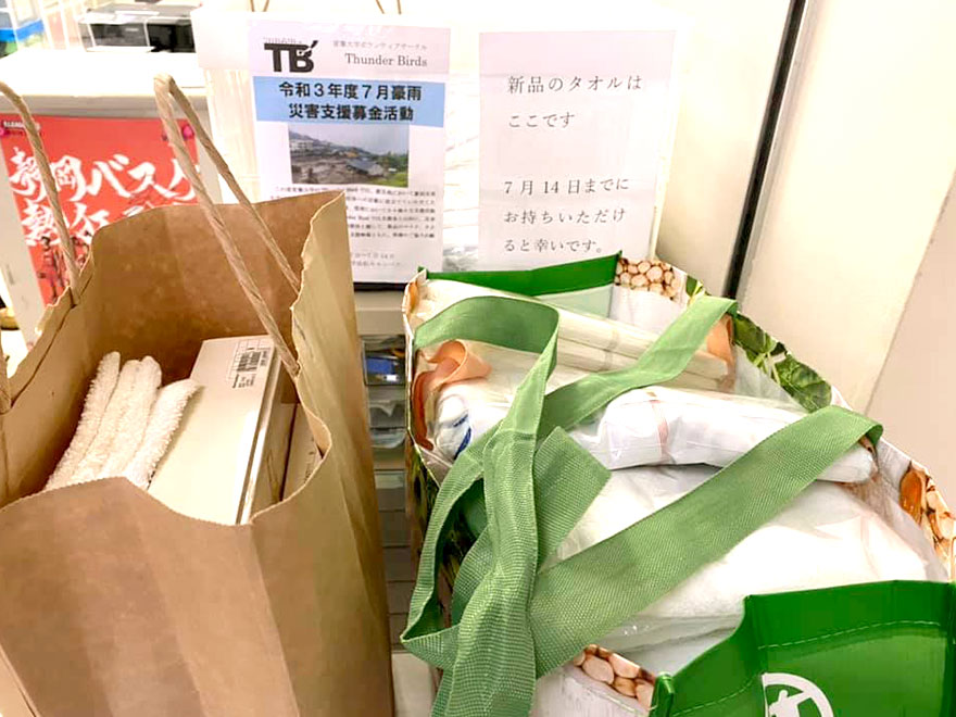 浜松キャンパスボランティアサークルThunderBirdsは、7月3日に発生した静岡県東部豪雨災害において、浜松キャンパス内で募金活動とタオルの回収を行いました。7月末までに回収したタオルは、草薙キャンパス地域貢献センターで回収したものと合わせて、熱海市へ送付しました。また、8月30日(月曜日)、代表の太田知里さん(健康栄養学科4年)と副代表の松下航大さん(経営学部4年)が学内で集めた募金を浜松市社会福祉協議会北地区センターへ届けました。災害担当の松下さんは「少しでも熱海市で被災された方々のお力になればうれしく思う。コロナ禍で現地での支援活動ができない中ですが、私たちがでできる支援活動を続けていきたい」と今後の活動継続を誓いました。