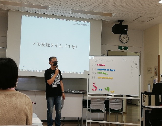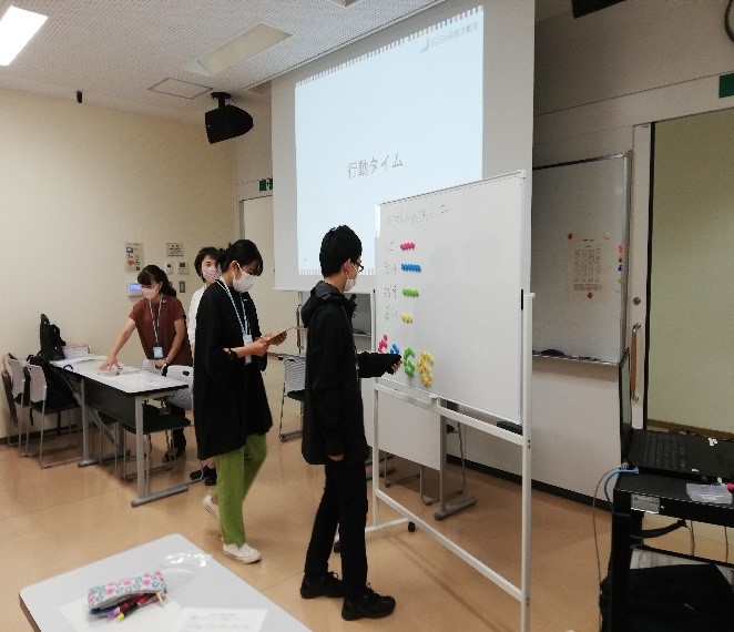 SDGsと地方創生のテーマでは、一般社団法人ローカルSDGsネットワークの講師を招き、「SDGs de 地方創生カードゲーム」を体験しました。これは、SDGsの考え方を地域の活性化に活かし地方創生を実現する方法について、カードゲームを通し参加者全員で考えるものです。学生には、行政担当者、一次産業従事者、まち工場の経営者などの役割が与えられ、チームごとにプロジェクトを進めます。1ターン10分の間にプロジェクトを通して得られる各チームのゴール達成状況と地域の若年人口、経済、環境、暮らしのバロメーターを評価し、4ターンを行い終了します。