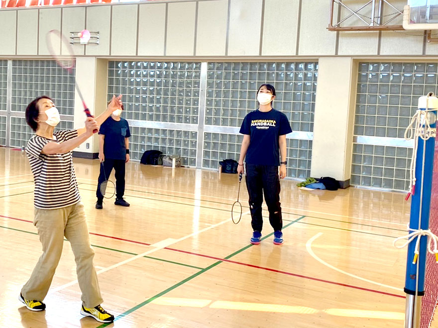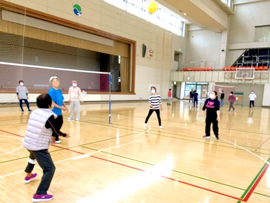 今年度、この時期の参加者は約25名で、平均年齢は75歳。この日はバトミントン、ワンバウンドバレーボール、ソフトボールを学生とともに楽しんでいました。