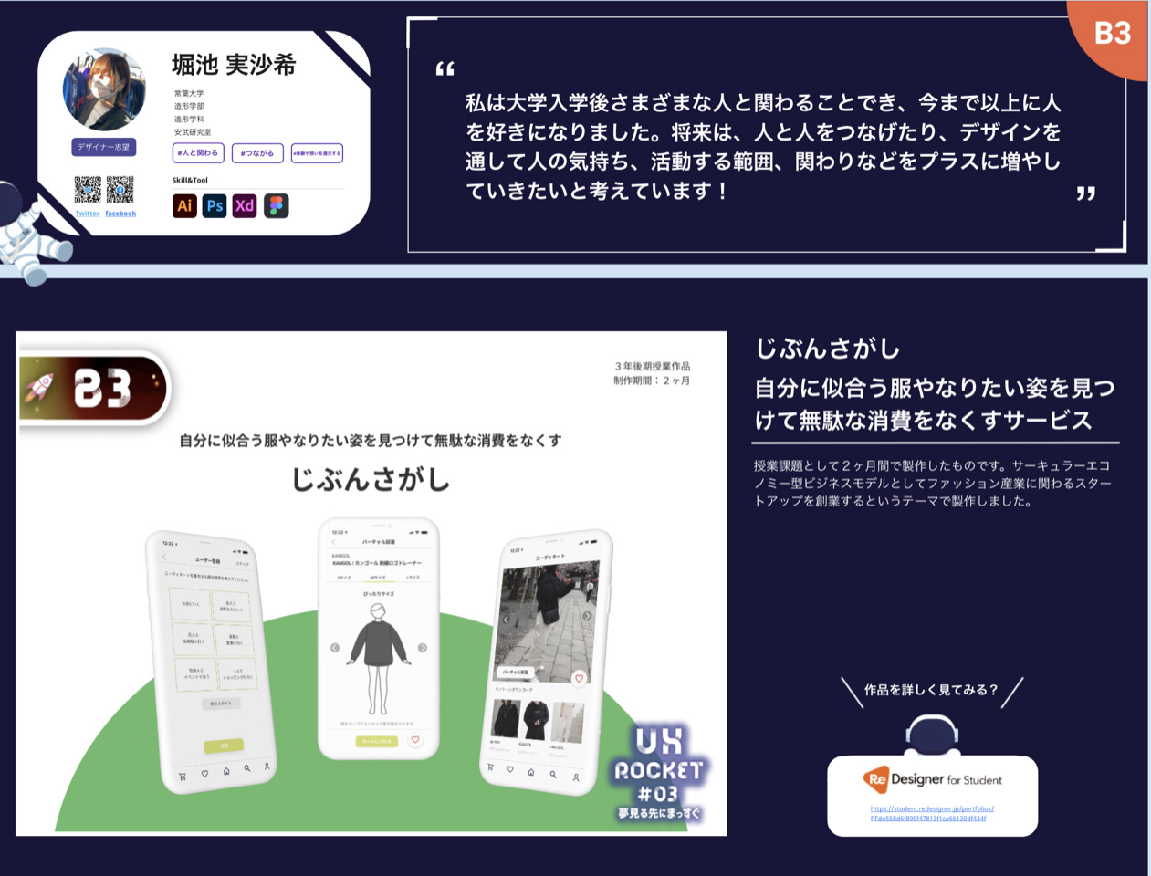 | 「じぶんさがし」 自分に似合う服やなりたい姿を見つけて無駄な消費をなくすサービスのデザイン ビジュアルデザイン3年 堀池実沙希 |