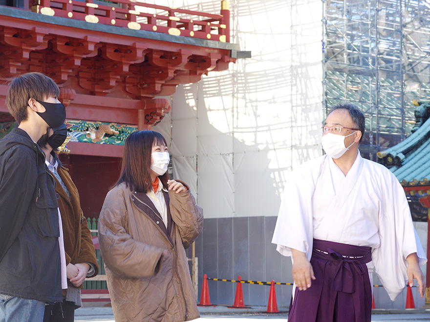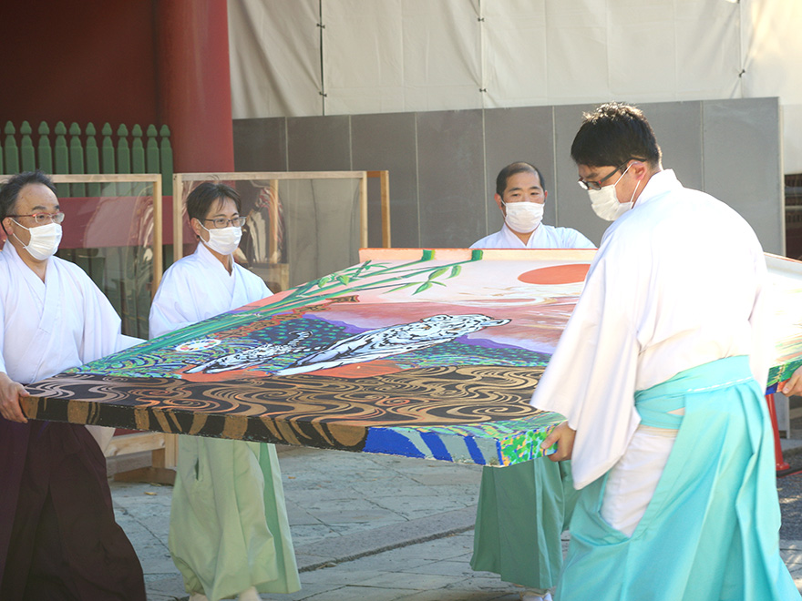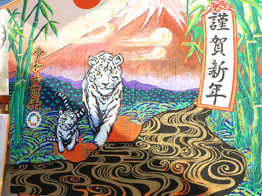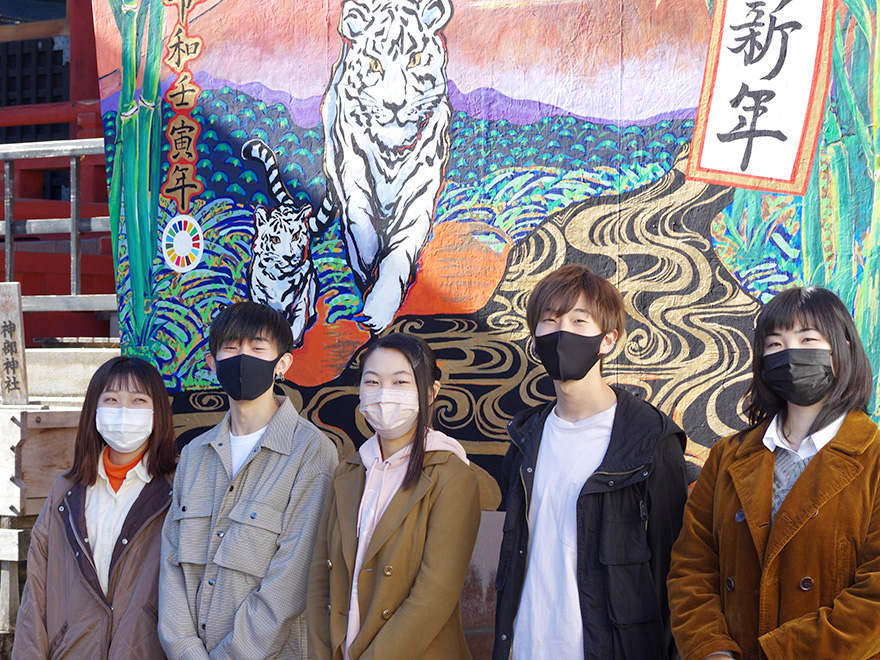 年末年始にかけて静岡市葵区の静岡浅間神社に、令和4年の干支「寅(とら)」の大絵馬が設置されました。これは造形学部による地域貢献活動として今年で10年目になります。大絵馬の大きさは高さ3メートル、幅2メートル半です。合津ゼミの活動の一環として、多くの学生が11月中旬よりデザインを考え制作しました。コロナ禍でマスク着用と「三密」を防ぎながらの制作は、苦労と手間がかかりましたが、達成感は一入でした。