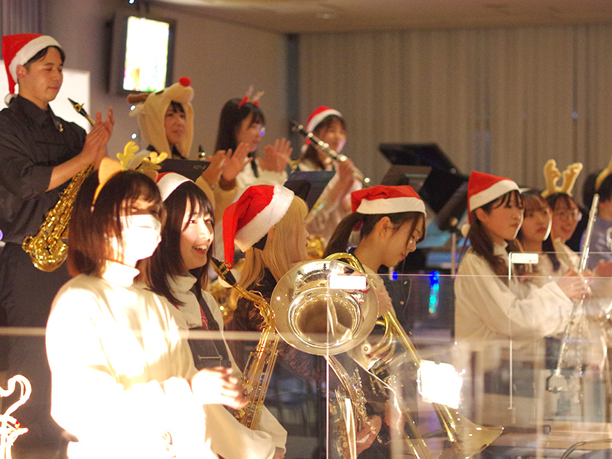 「造形学部と音楽科合同のイベントを実施し、瀬名キャンパスを盛り上げたい。」そんな静岡瀬名キャンパス学友会の強い思いで企画された今回のクリスマス会は、造形学部の学生と音楽科の学生の合同の演奏で締めくくりました。