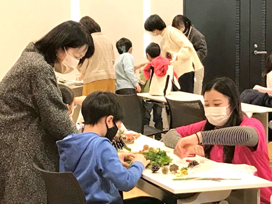 12月22日(水曜日)、サーラ音楽ホールで、こども健康学科3年の学生6名が、「親子でクリスマスツリーを作るワークショップ」を開催しました。これは、本学と浜松市サーラ音楽ホールとの連携事業のひとつとして開催されました。